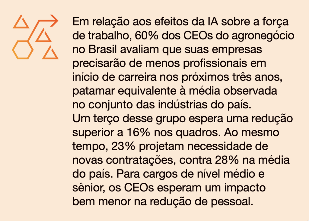 Sobre os impactos na força de trabalho, 60% dos CEOs do agronegócio no Brasil avaliam que suas empresas precisarão de menos profissionais em início de carreira nos próximos três anos. Um terço desse grupo espera uma redução superior a 16% nos quadros, enquanto 23% projetam necessidade de novas contratações.