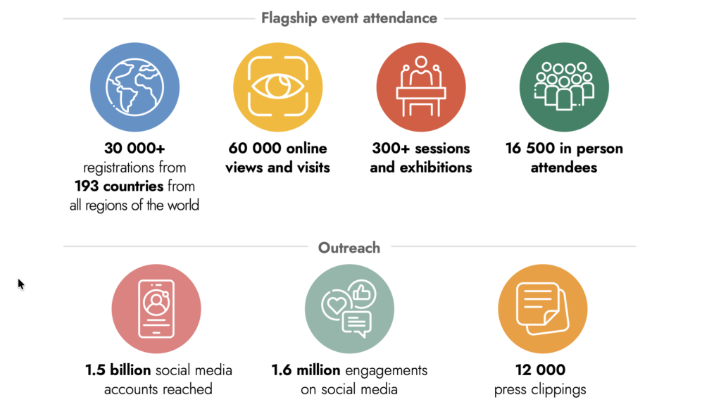 Com participação sem precedentes, o fórum registrou mais de 16.500 participantes presenciais, 60.000 visitas online e 30.000 registros de 193 países. Nas plataformas digitais, as campanhas do WFF e do Dia Mundial da Alimentação alcançaram 1,5 bilhão de contas de mídia social, geraram 1,6 milhão de engajamentos e receberam 12.000 clippings de imprensa, refletindo forte engajamento público e visibilidade internacional.